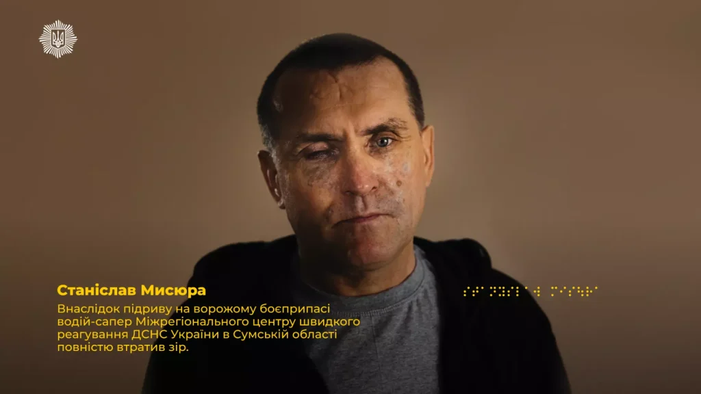 Одним із героїв фотопроєкту «Відчувати: душею і дотиком» став Станіслав Мисюра – водій-сапер Міжрегіонального центру швидкого реагування ДСНС України в Сумській області. Він повністю втратив зір внаслідок підриву на ворожому боєприпасі під час порятунку цивільного чоловіка.