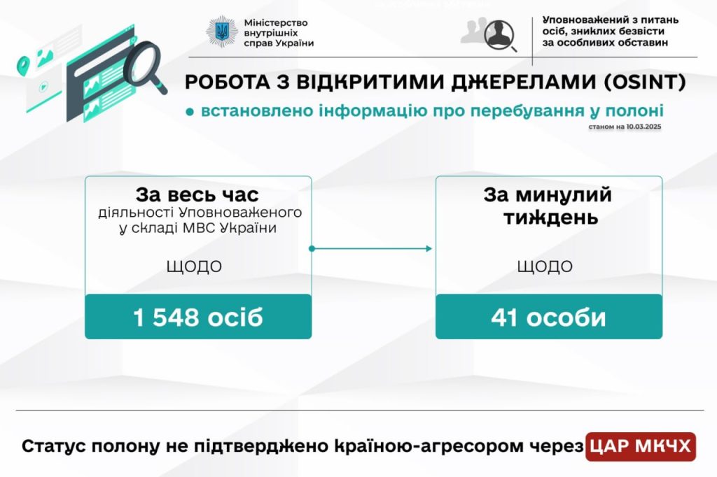За тиждень співробітники Управління з питань осіб, зниклих безвісти за особливих обставин МВС із застосуванням спеціалізованого програмного забезпечення здобули відомості про ймовірне перебування в полоні (заручниках) стосовно 41 особи.