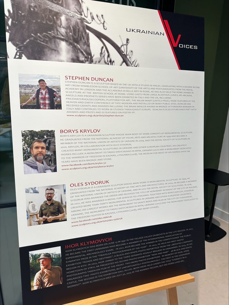 Зазначається, що проєкт об’єднує трьох членів Королівського товариства скульпторів: британського митця Стівена Дункана (Stephen Duncan) та українських скульпторів Олеся Сидорука і Бориса Крилова, які співпрацюють між Києвом і Лондоном. Виставка відображає їхній спільний творчий доробок і осмислення досвіду війни в Україні.
