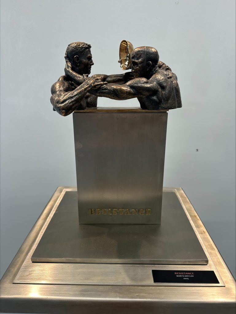 “Центральні роботи створені зі сталі використаних снарядів із поля бою та поєднують скульптуру з поезією. Вони зосереджують увагу на людському вимірі війни, водночас підкреслюючи теми стійкості, гідності та солідарності”, — йдеться в повідомленні.