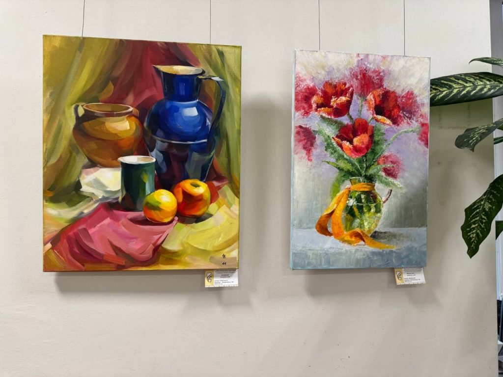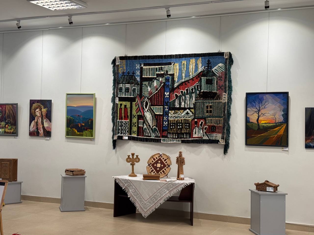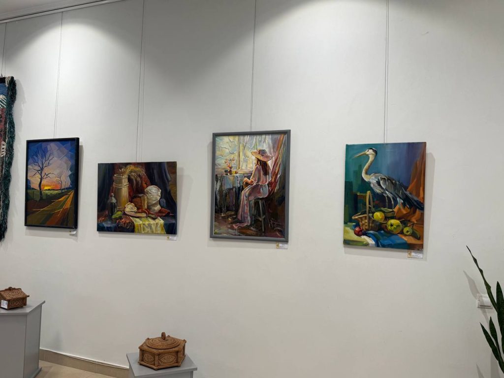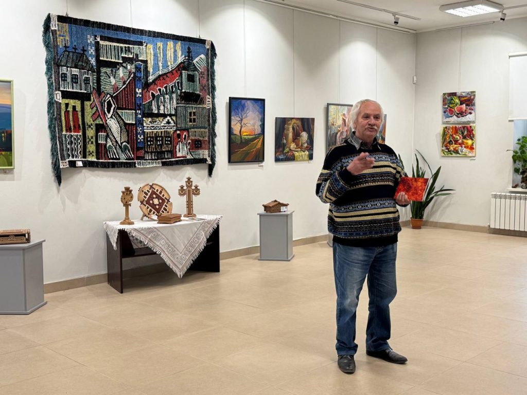 На подіумах і столі продемонстровано 15 виробів декоративно-прикладного мистецтва : деревʼяні різьблені скриньки, свічники, тарелі великоформатний гобелен і декоративні доріжки, кольє виконані з художнього металу, а також вишита-мережана святкова скатертина. На стінах 33 живописних твори, 21 рисунок та 2 графічних твори.